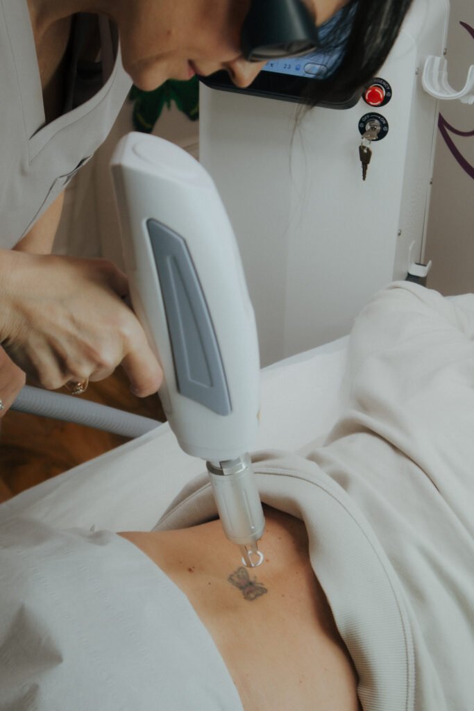 The laser emits short, high-intensity pulses that target the pigment particles in the skin. These light pulses break the ink into microscopic fragments, which are then naturally absorbed and eliminated by the body’s immune system over the following weeks. The process precisely targets the tattooed area while leaving the surrounding skin undamaged.