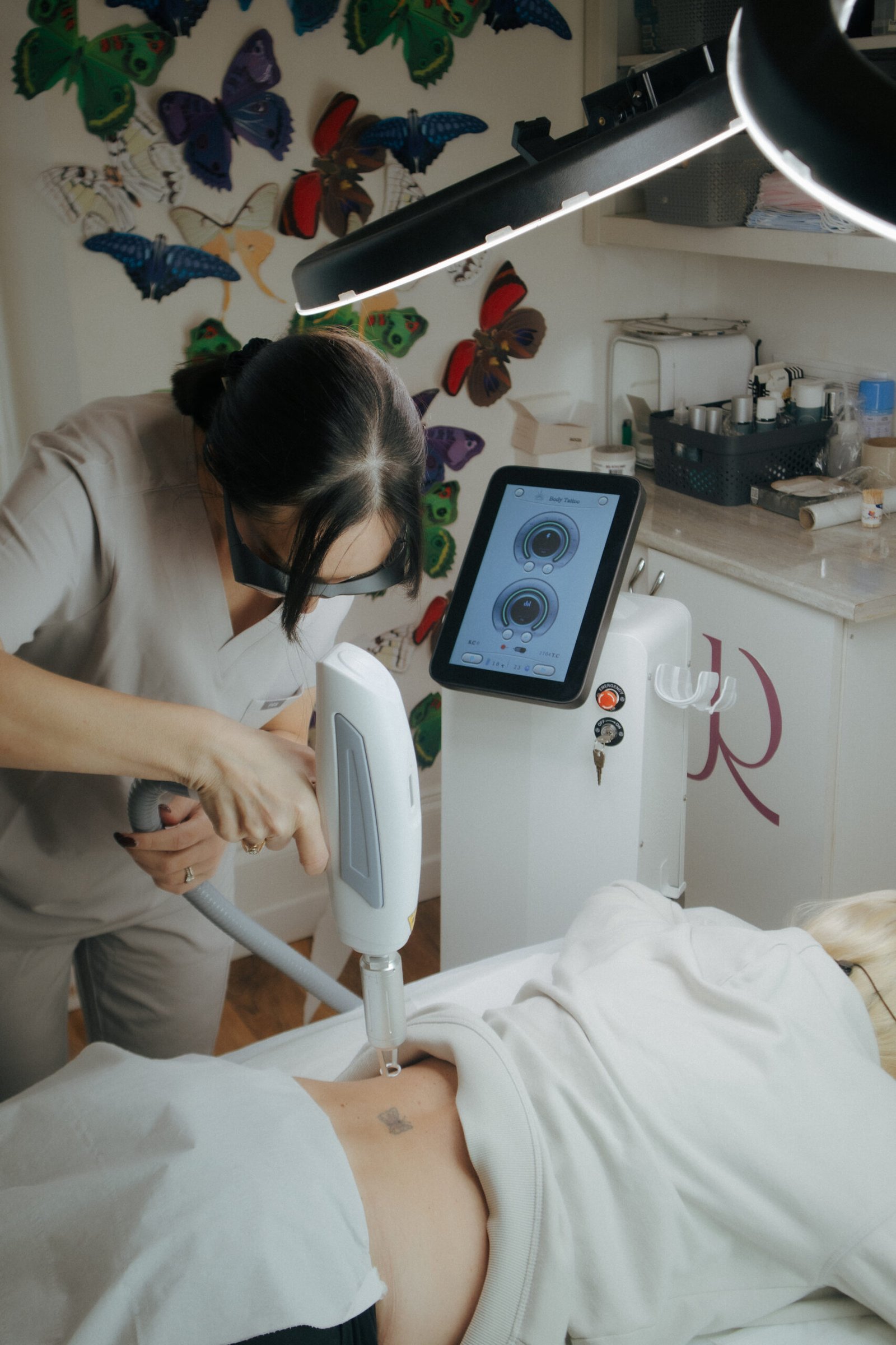 Julia Roe, laser tattoo removal is carried out using a Q-Switch ND:YAG laser, a medical-grade machine designed for safe and effective pigment removal.