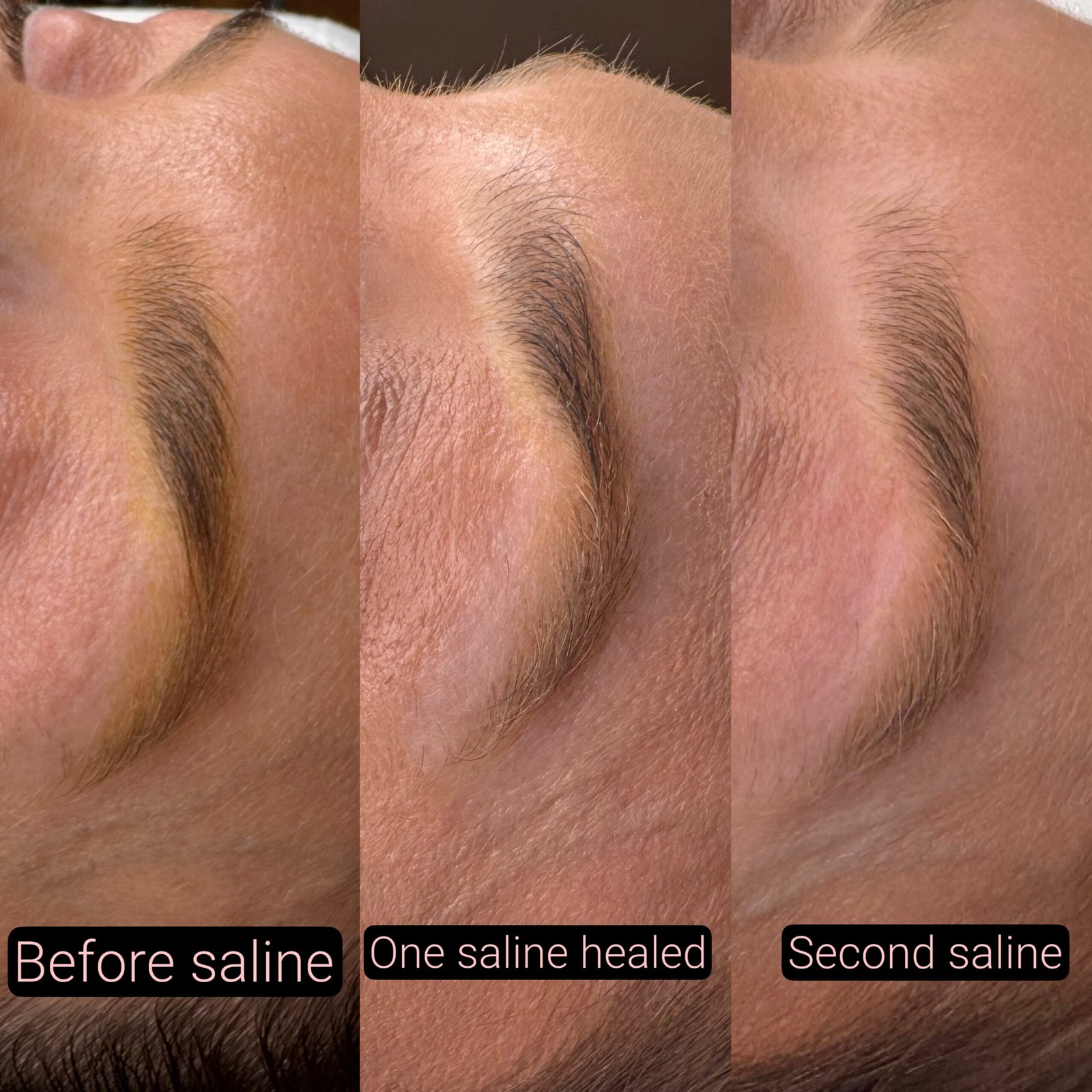 The technique uses a tattoo machine to implant the saline solution into the skin, just as pigment is applied during a tattoo. The salts draw out pigment particles during the healing process, allowing them to lift naturally through the skin’s surface.